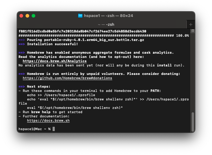 설치가 마무리 될 때 즈음 Run these commands in your terminal to add Homebrew to yourPATH:라는 문장과 함게 아래 3줄의 명령어가 나오게 되는데, 해당 명령어들을 복사/붙여넣기 하고 리턴을 누르면 설정이 성공적으로 마무리 됩니다. 해당 명령어도 아래 코드 블럭에 추가해 두겠습니다.