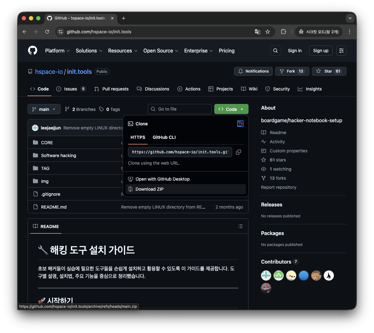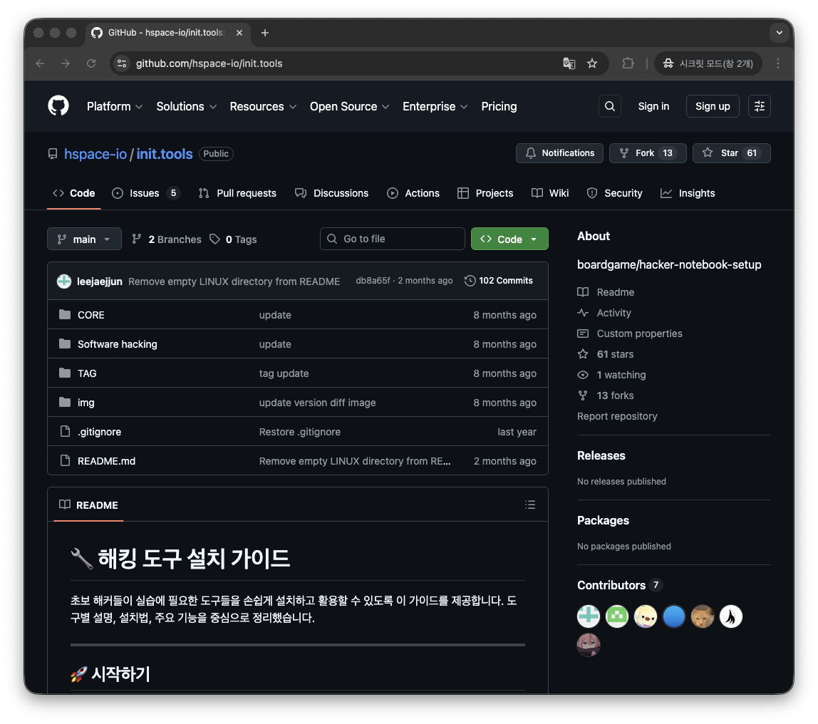 git clone <repository address>그럼 실제로 어떻게 사용하는지 아래의 에제를 따라해보시면 이해가 잘 되실거라고 생각합니다. 저희가 가져올 저장소는 HSPACE의 init.tools 라는 저장소입니다. 해당 저장소는 이 문서에서 소개하지 않는 많은 도구들을 설명하고 있기에 후에 다양한 도구들도 사용해 보시면서 자신에게 맞는 도구를 찾으시길 추천드립니다.