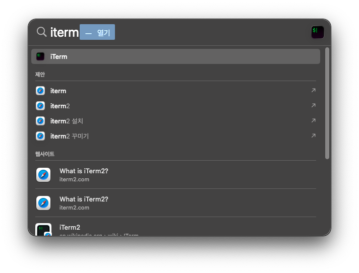 다음으로 ⌘(Command)+Space 입력후 나온 Spotlight 창에 iterm을 입력하고 입력이 뜨면 리턴을 눌러 iTerm2 실행합니다.