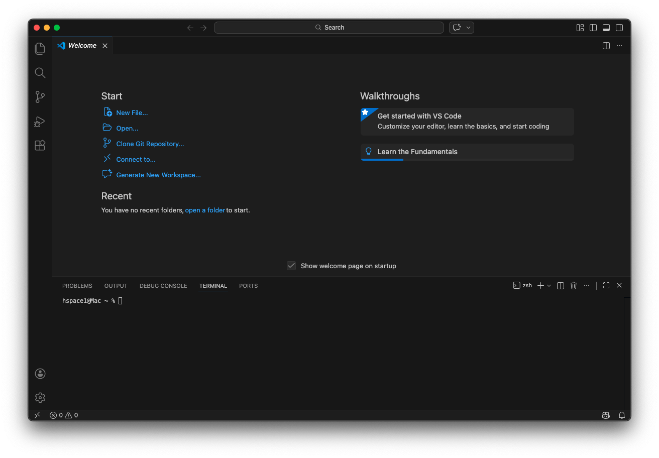 또는 단축키 ⌘(Command) + ` 을 누르면 됩니다. 그러면 아래 이미지와 같이 터미널이 열리는 것을 확인하실 수 있습니다.