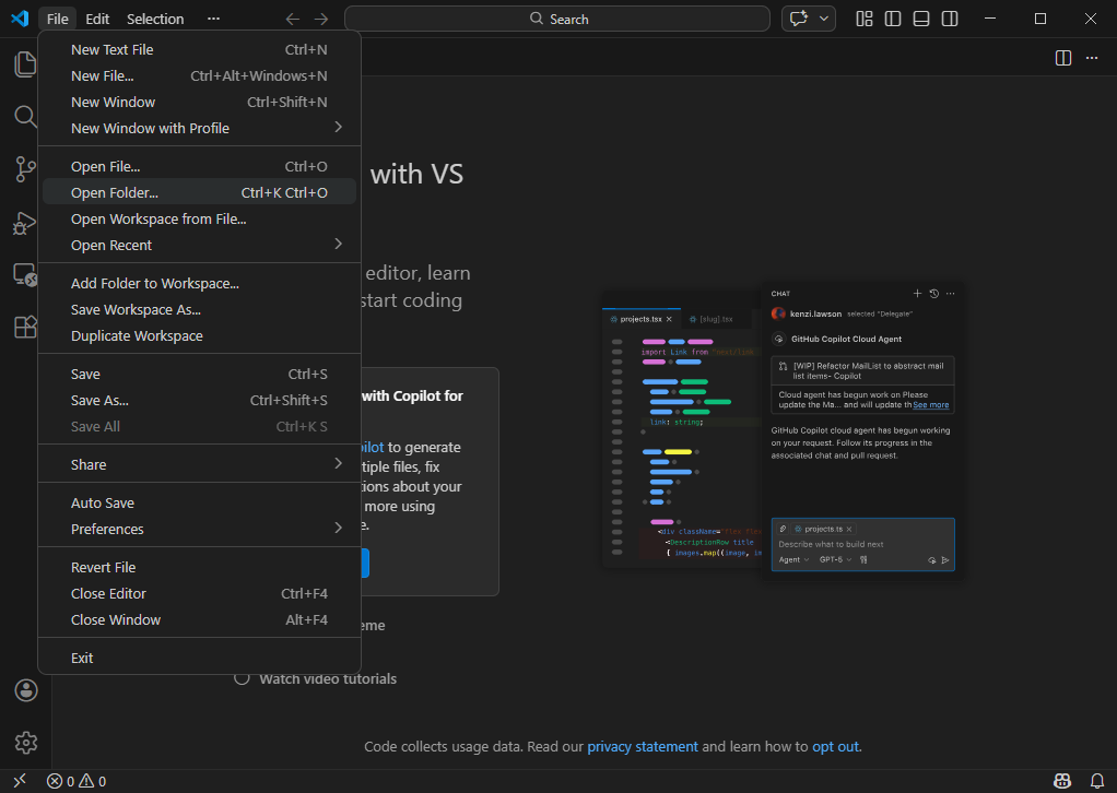 폴더나 파일은 여는 방법에 대해서 알려드리겠습니다. 폴더를 열기 위해서는 VSCode 상단 메뉴바에서 File > Open File 또는 File > Open Folder를 선택하시면 됩니다.