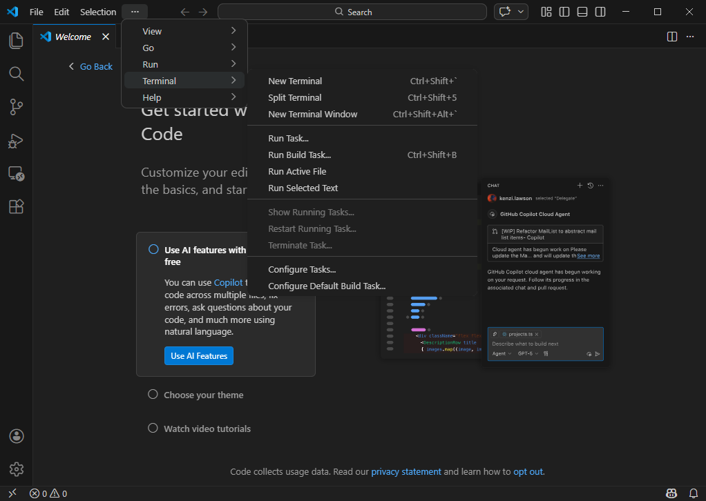 VSCode에서 터미널을 사용하는 방법을 알려드리자면, 상단 메뉴바에서 Terminal > New Terminal을 선택하시면 됩니다.