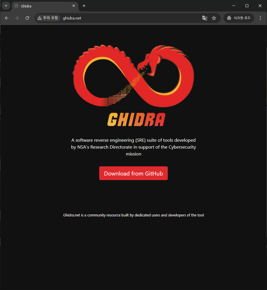 우선 Ghidra 공식 웹사이트에 접속합니다. 공식 웹사이트는 아래 이미지와 같이 생겼습니다.