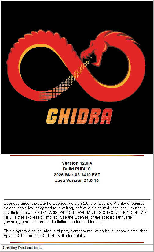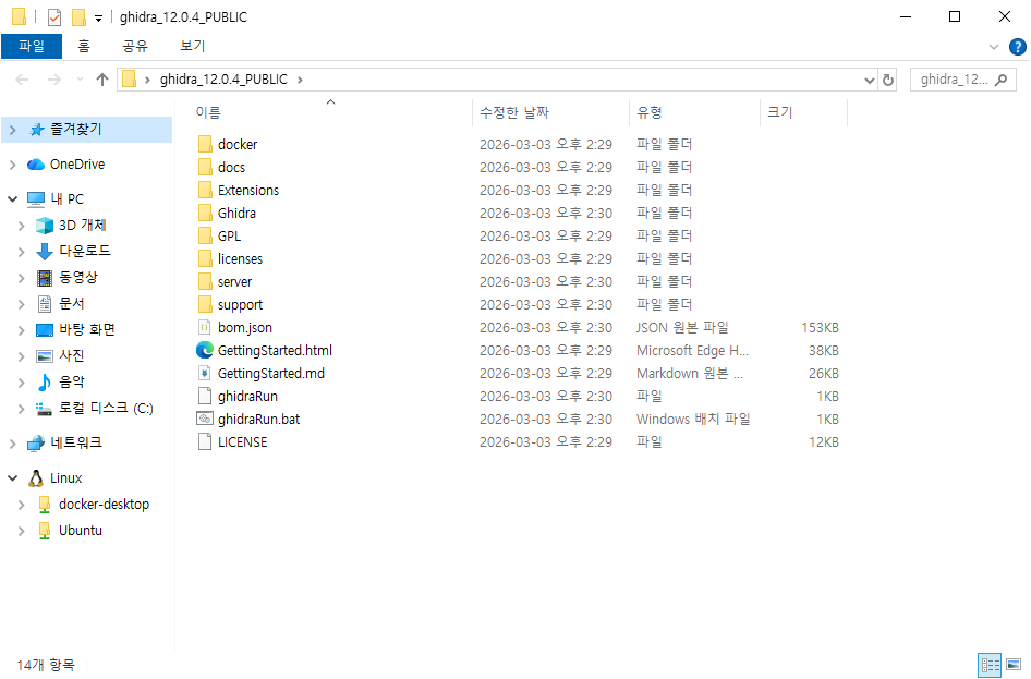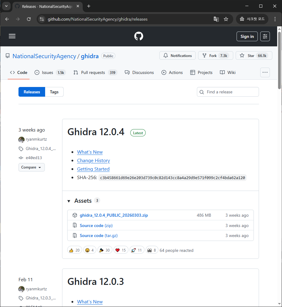 위 사이트에서 가장 최신의 버전(최상단)을 다운 받으면 됩니다. 작성시기1 기준으로는 12.0.4 버전이 가장 최신 버전입니다. 그럼 Assets 하단의 ghidra_12.0.4_PUBLIC_20260303.zip 파일을 다운 받으시면 됩니다.