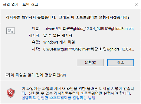 ghidraRun.bat를 실행할 때 아래와 같은 경고창이 나올 수 있지만, 실행(R) 버튼을 누르고 계속 진행하시면 됩니다.