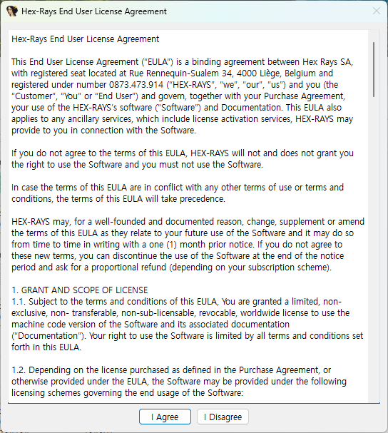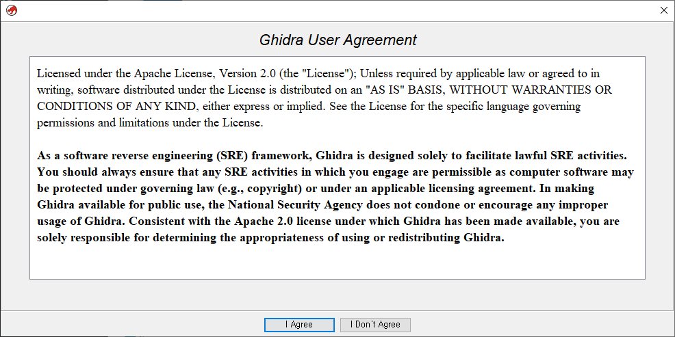 이후 IDA를 실행하면 아래 이미지와 같은 창이 나옵니다. 동의를 선택하고 넘어가시면 됩니다.