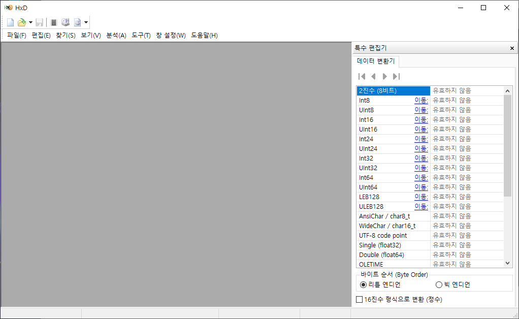 HxD를 실행하면 아래 이미지와 같은 창이 나오게 됩니다.
