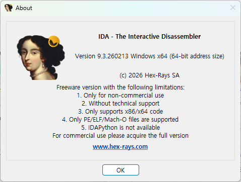 IDA는 Hex-Rays에서 제작한 도구로, Free 버전의 경우 약간의 제약이 있긴 하지만 입문 단계에서는 충분한 기능을 가지고 있습니다.