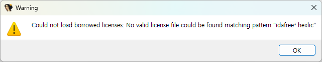그러면 현재 IDA Free의 라이센스가 등록되어있지 않기에 아래 이미지와 같은 경우 창이 나오게 됩니다.