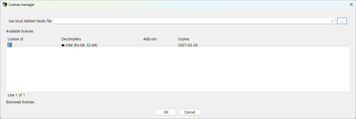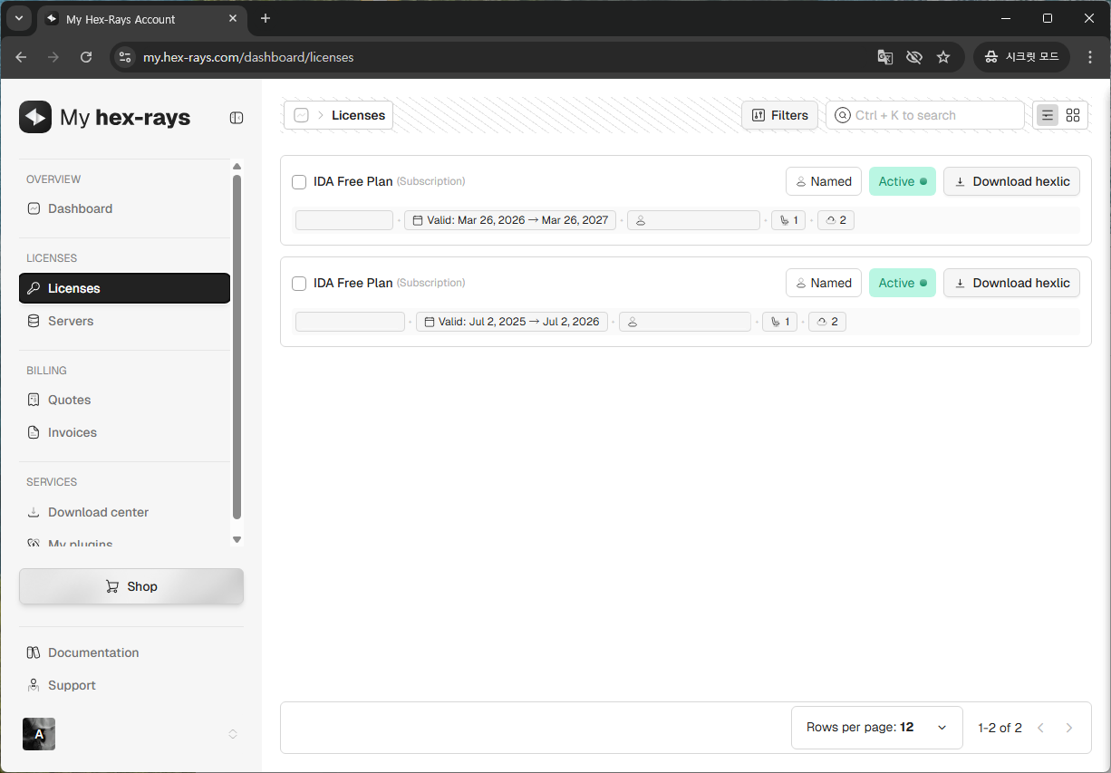 이후 My hex-rays의 Licenses 탭에서 Download hexlic으로 IDA Free의 라이센스 파일(이하 .hexlic 파일)을 다운 받습니다.