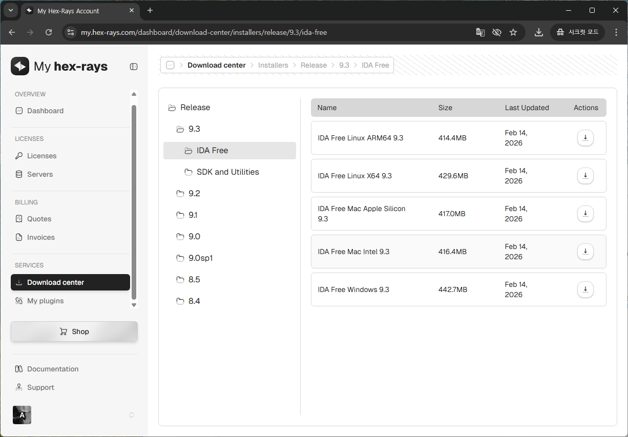 좌측의 메뉴에서 Download center 탭으로 이동하고, 최신 버전(Release 바로 아래 버전)을 선택한 다음 IDA Free를 선택합니다. 그리고 현재 호스트 기기의 OS에 맞는 설치 파일을 다운 받으시면 됩니다.