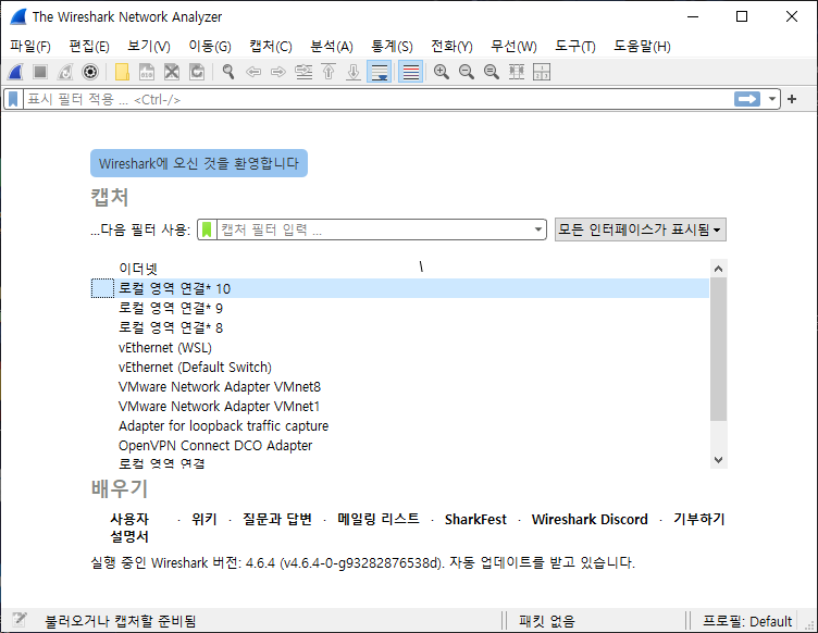 Wisreshark를 실행시켜보면 아래와 같은 창이 나오게 됩니다.